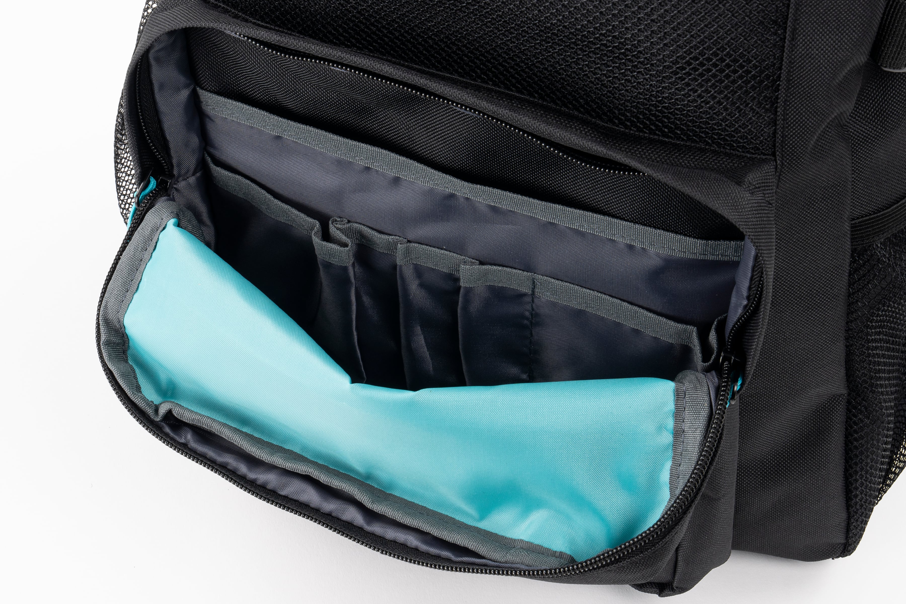 容量は約30Lとたっぷり収納できるサイズで、通勤・通学時の参考書や書類、ノートパソコンなども楽々収納可能。両サイドにはメッシュポケットを備え、ドリンクホルダーとしても便利にお使いいただけます。